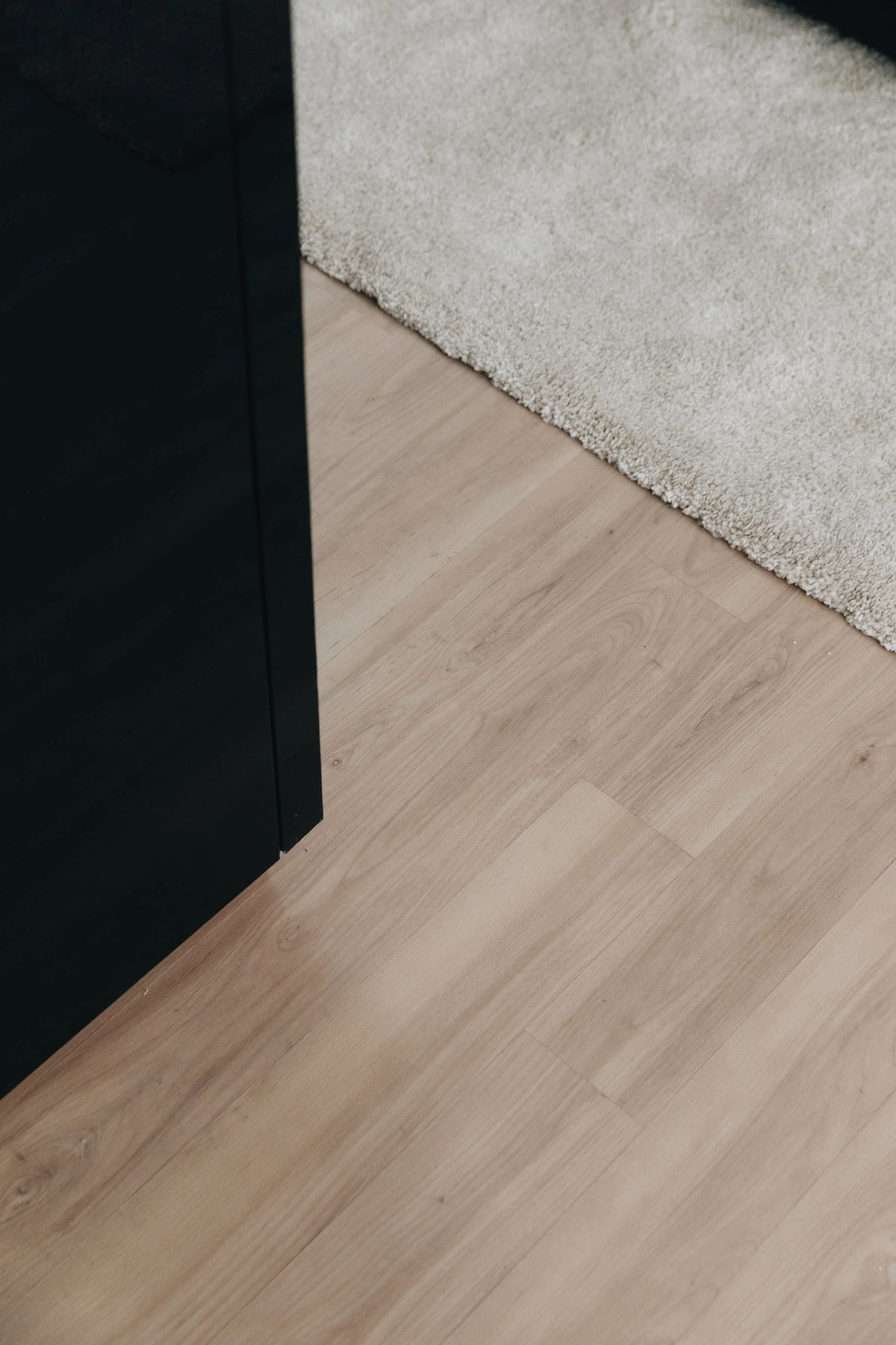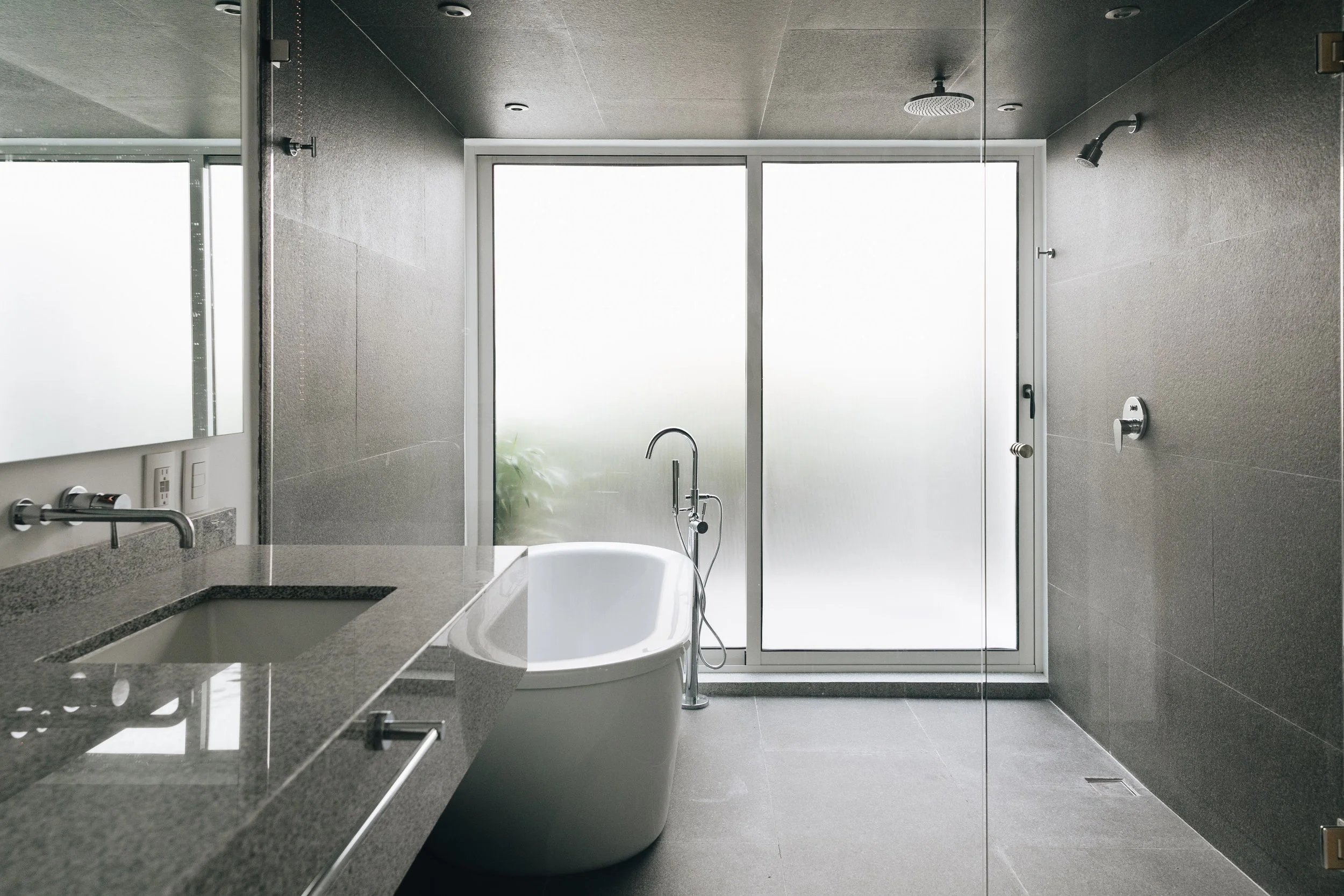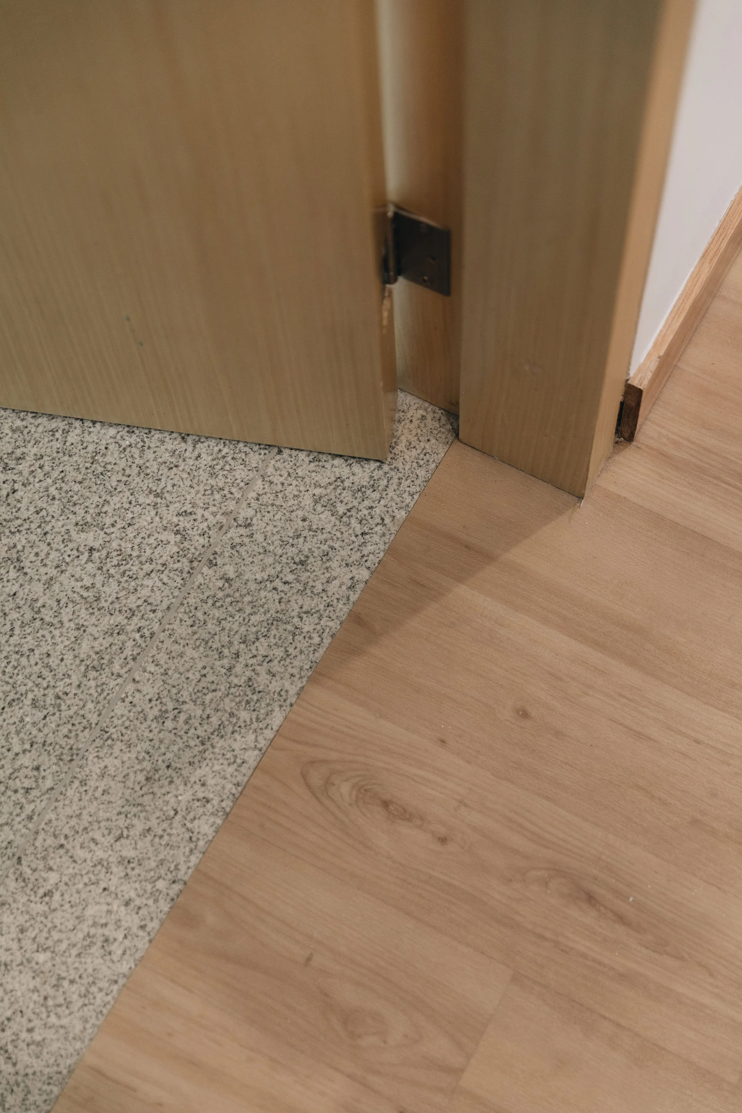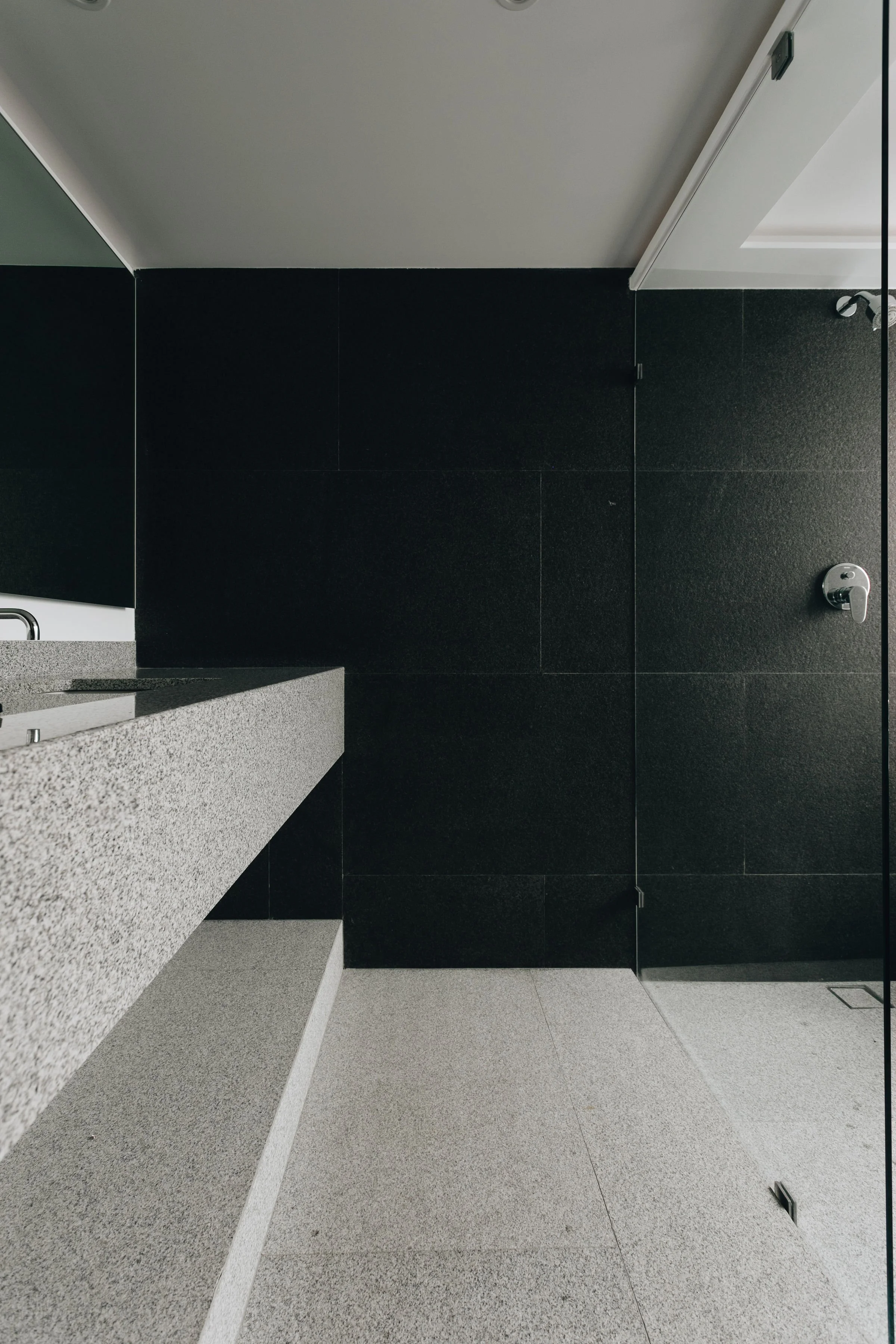 Granito Grisal y granito San Gabriel cepillado en baños, vinil LVT en piso, deck sintético en terrazas.