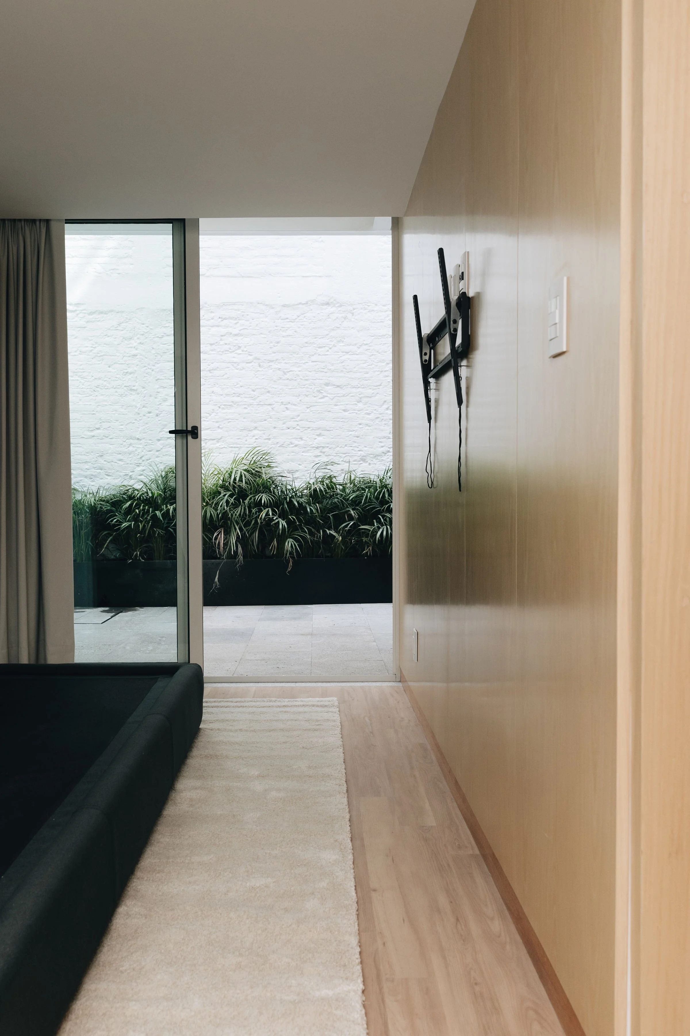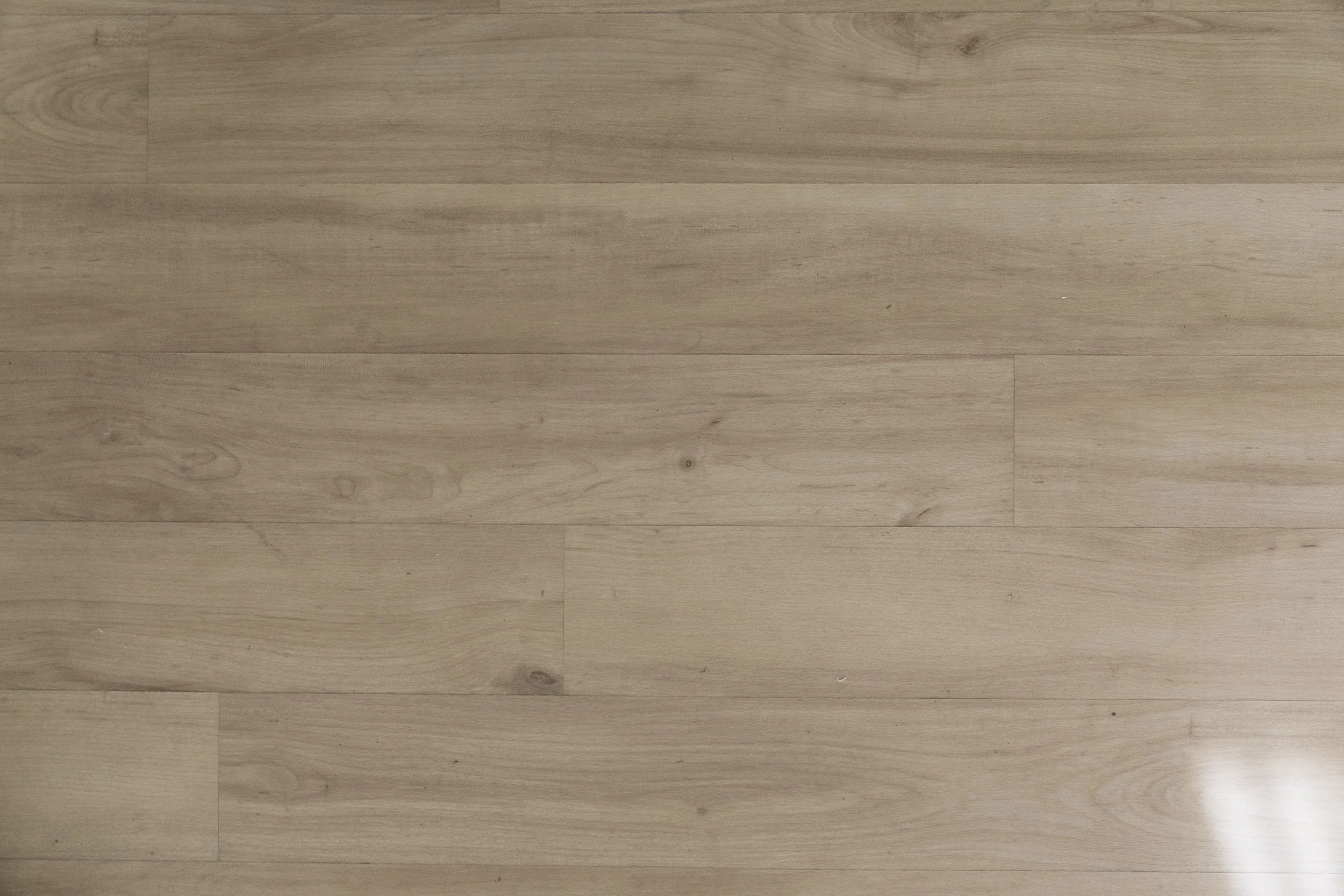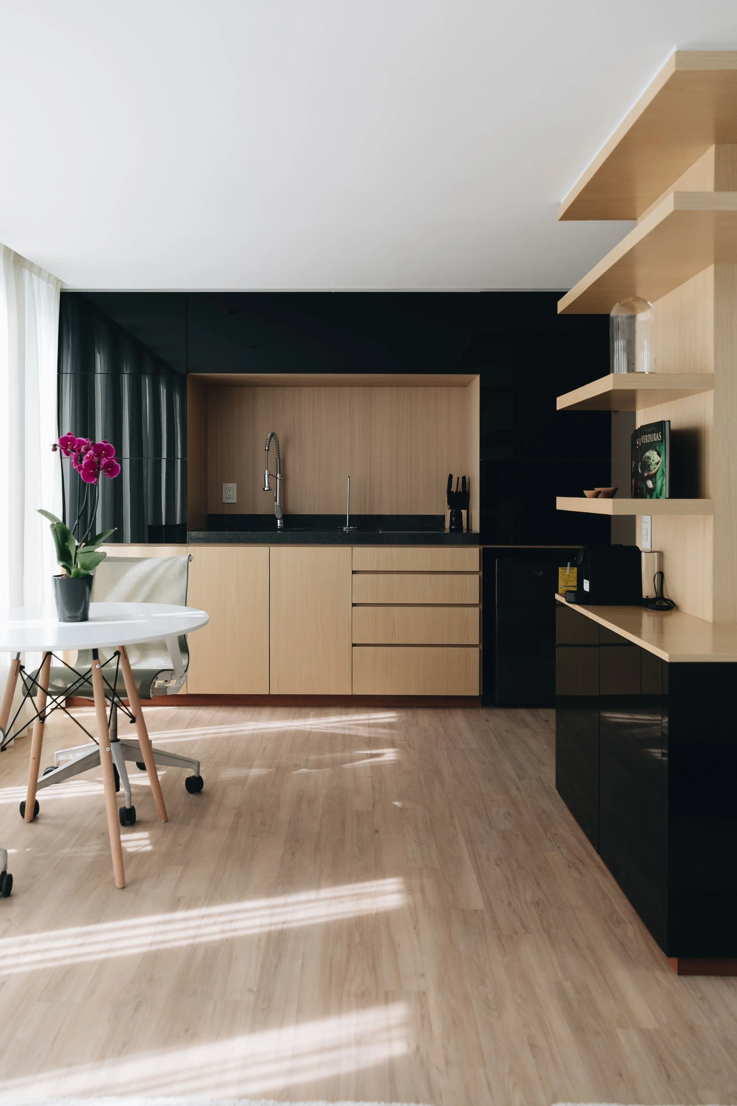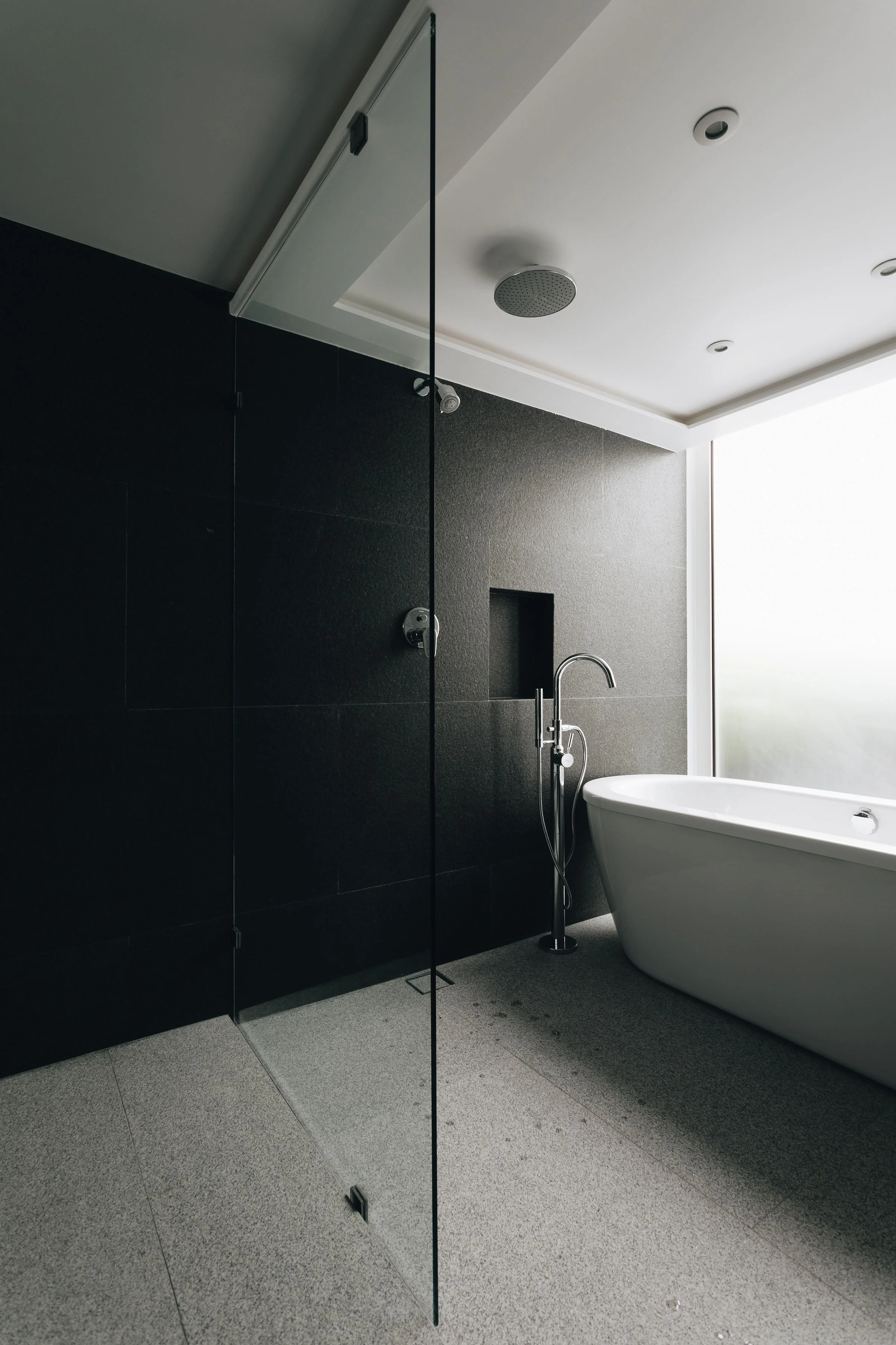 Granito Grisal y granito San Gabriel cepillado en baños, vinil LVT en piso, deck sintético en terrazas.