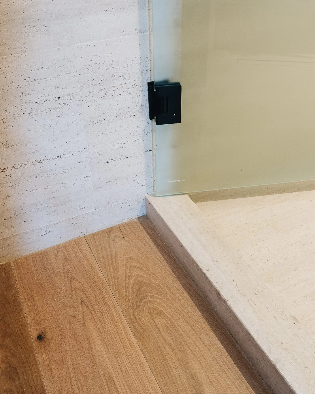 Travertino al corte en piso y muro de baño. Duela de ingeniería de roble a la medida en piso.